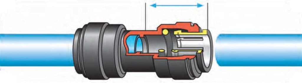 Our push-in fitting has a collet (gripper) with stainless steel teeth which holds the pipe firmly in position and an O-Ring to provide a permanent leak proof seal.